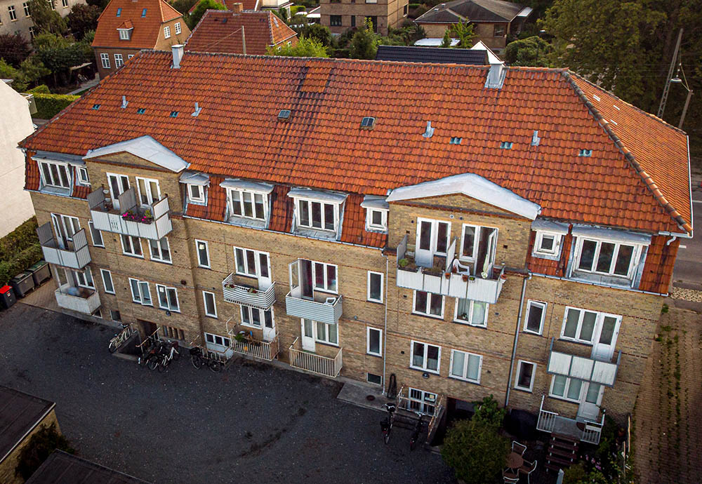 Vi er fælles om en aflåst cykelkælder, vaskekælder, tørrerum, værksted, loftsrum og en dejlig have.